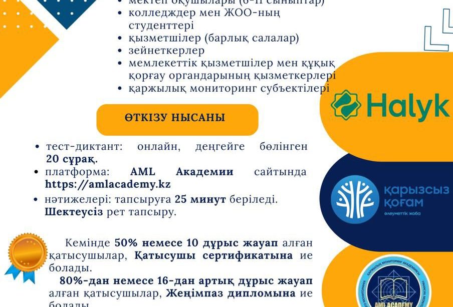 🔏Диктант күрделілік деңгейі бойынша (оқушылар, ересектер, қаржылық мониторинг субъектілерінің қызметкерлері) бөлінген сұрақтармен онлайн-тестілеу форматында өтеді.