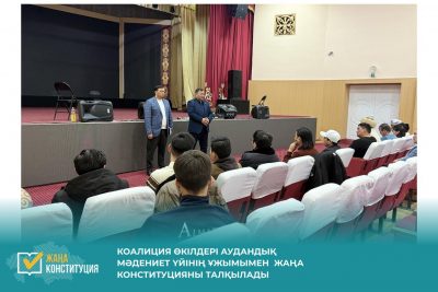 Бүгін Коалиция мүшелері аудандық мәдениет үйінің ұжымымен кездесу өткізді. Кездесу барасында жаңа Конституция жобасының саяси жүйені жаңғыртуға бағытталған нормаларын түсіндірді. ...Конституциялық реформалар – еліміздің саяси жүйесін жаңғыртуға бағытталған маңызды қадам